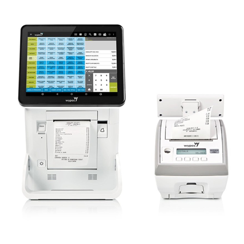 Registratore telematico con tastiera di servizio a scomparsa e POS touch screen da 10” con stampante di ricevute termiche e display di cortesia integrato per consentire la massima razionalizzazione degli spazi.